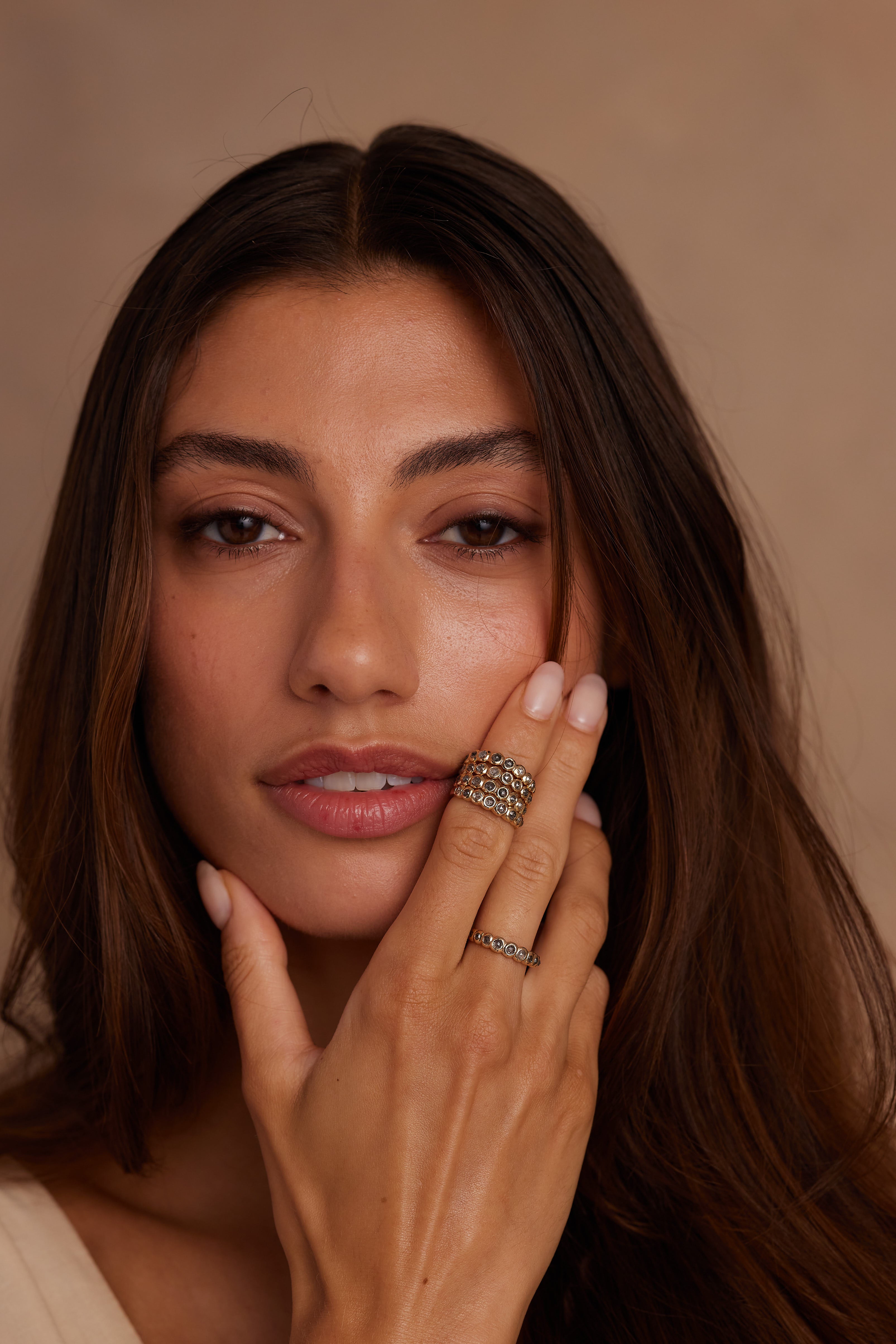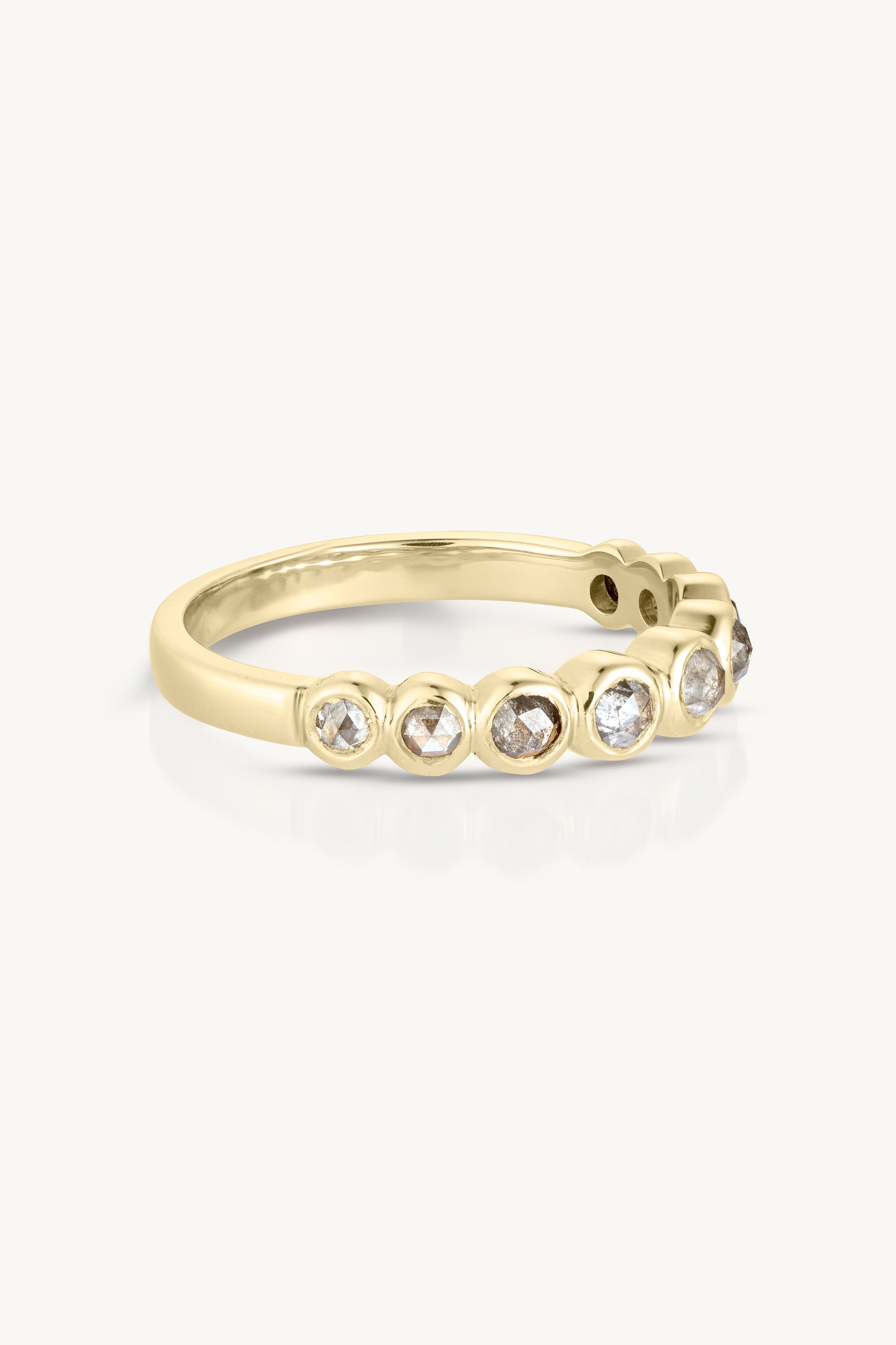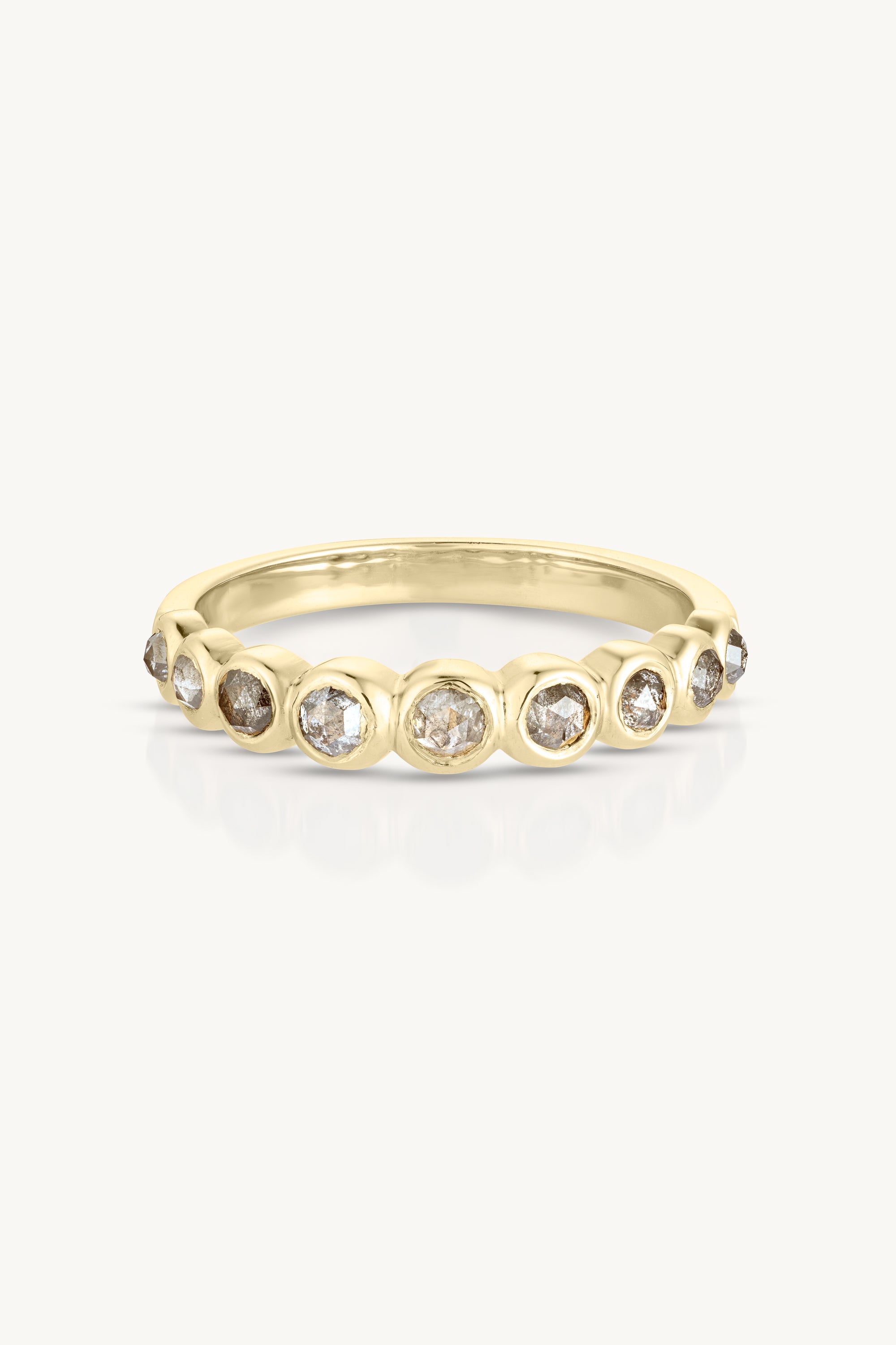 A celebration of love in all its beautiful complexity. This 14K Yellow Solid Gold band is adorned with Grey Diamonds set one by one in delicate bezels, wrapping the finger in quiet brilliance. Each diamond is naturally one of a kind, with soft smokey hues and subtle shifts that reflect the uniqueness of your story.