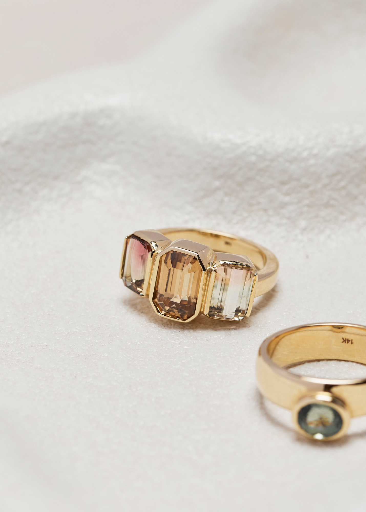 This epic statement ring features 3 handcut baguette Tourmaline stones with peach and bi colour watermelon colouring. The ring has light peachy amber tones and is a stunning statement piece.
