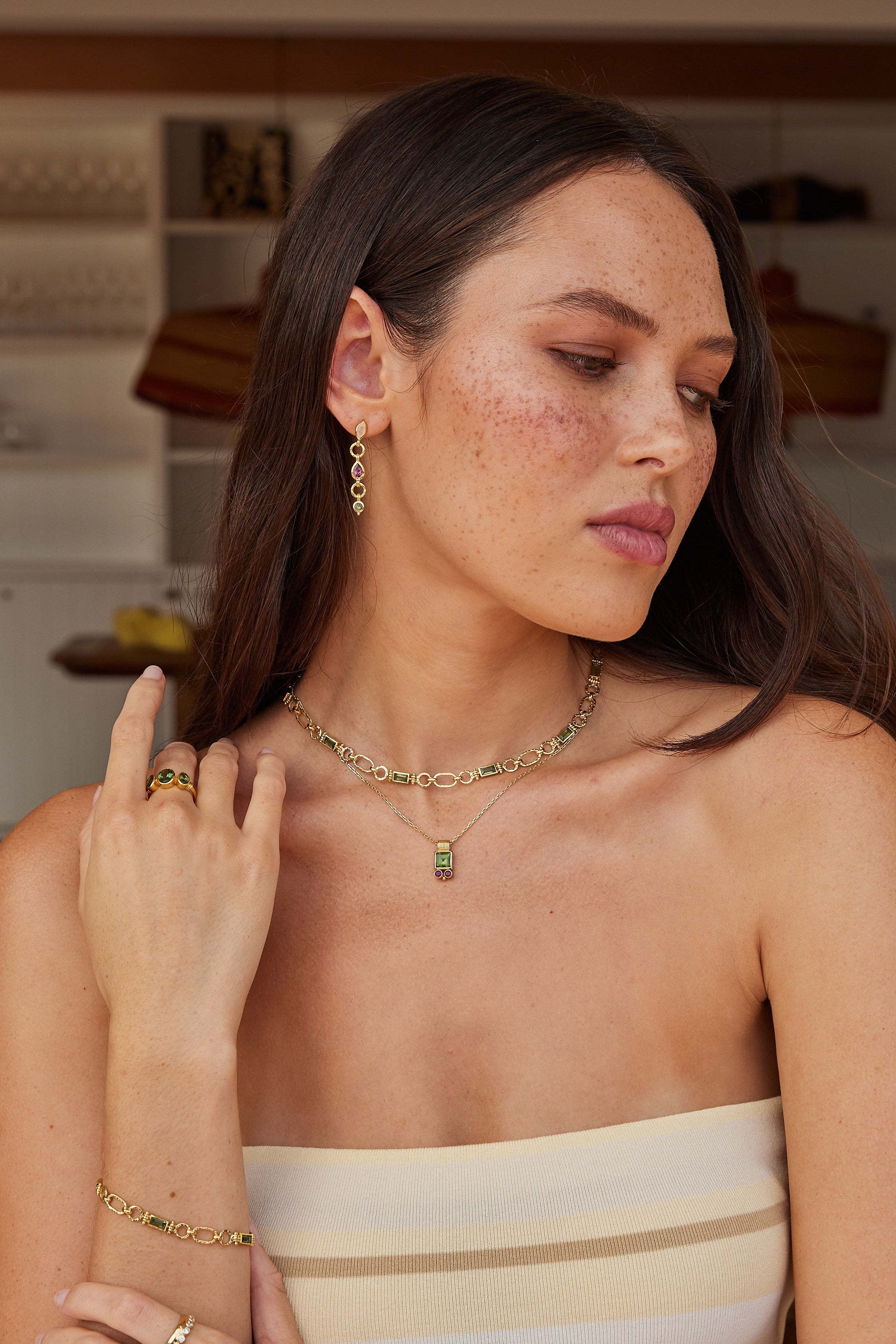 A name rooted in grace, a design shaped by strength. The Adela Necklace features a bezel-set square Apatite, accented by two round Rubies.