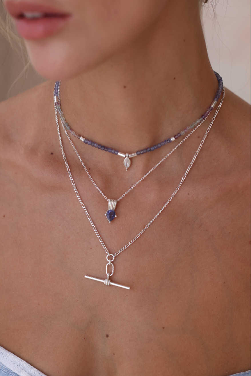 This pendant comes on a 40cm cable chain. It is available in Moonstone, Apatite and Iolite.