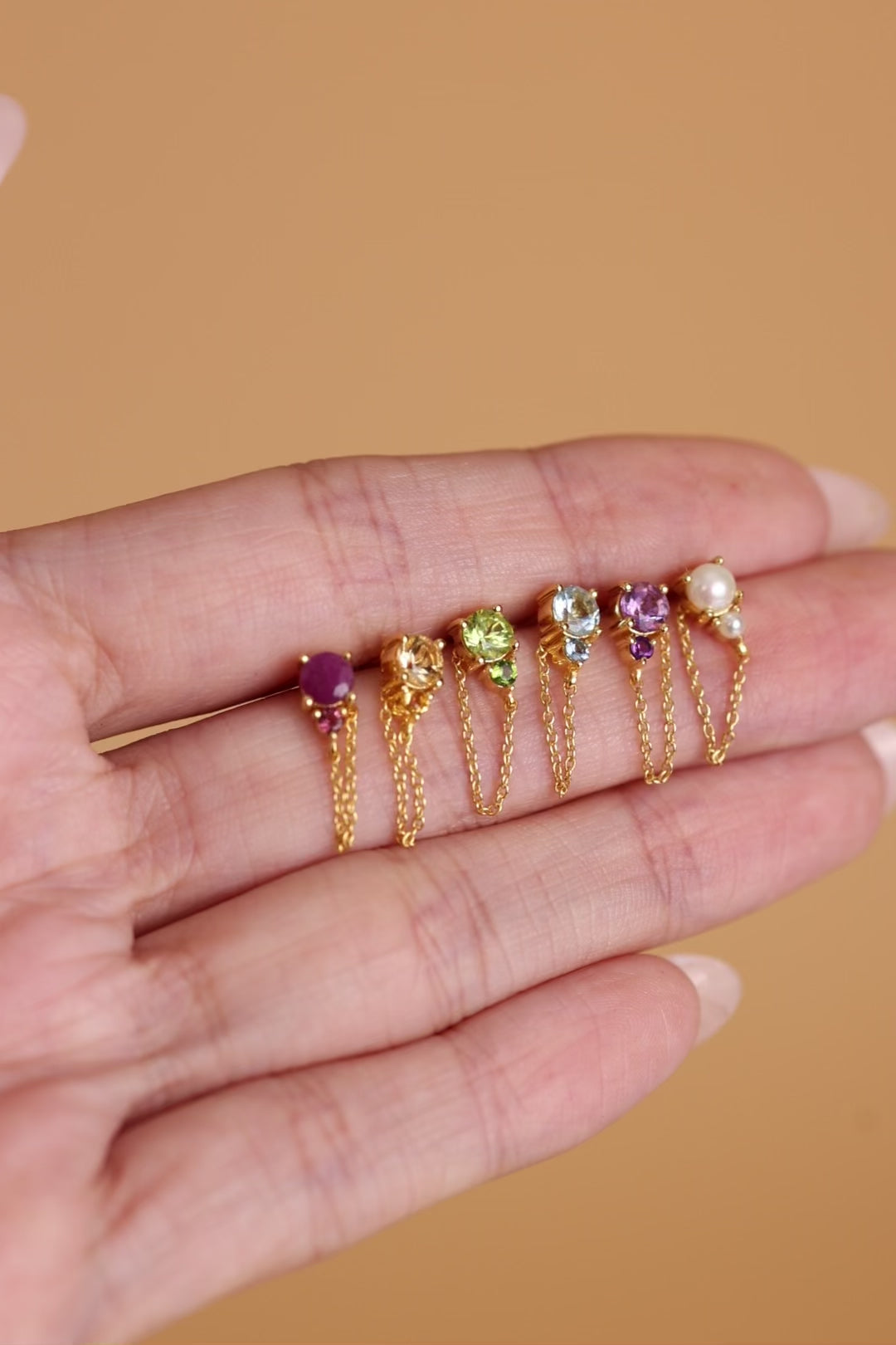 Each birthstone is claw-set in both a larger and smaller stone, creating a subtle ombre effect. A versatile and delicate chain loops from the front of the stud, allowing you to adjust its placement or layer up your ear with other birthstone studs.