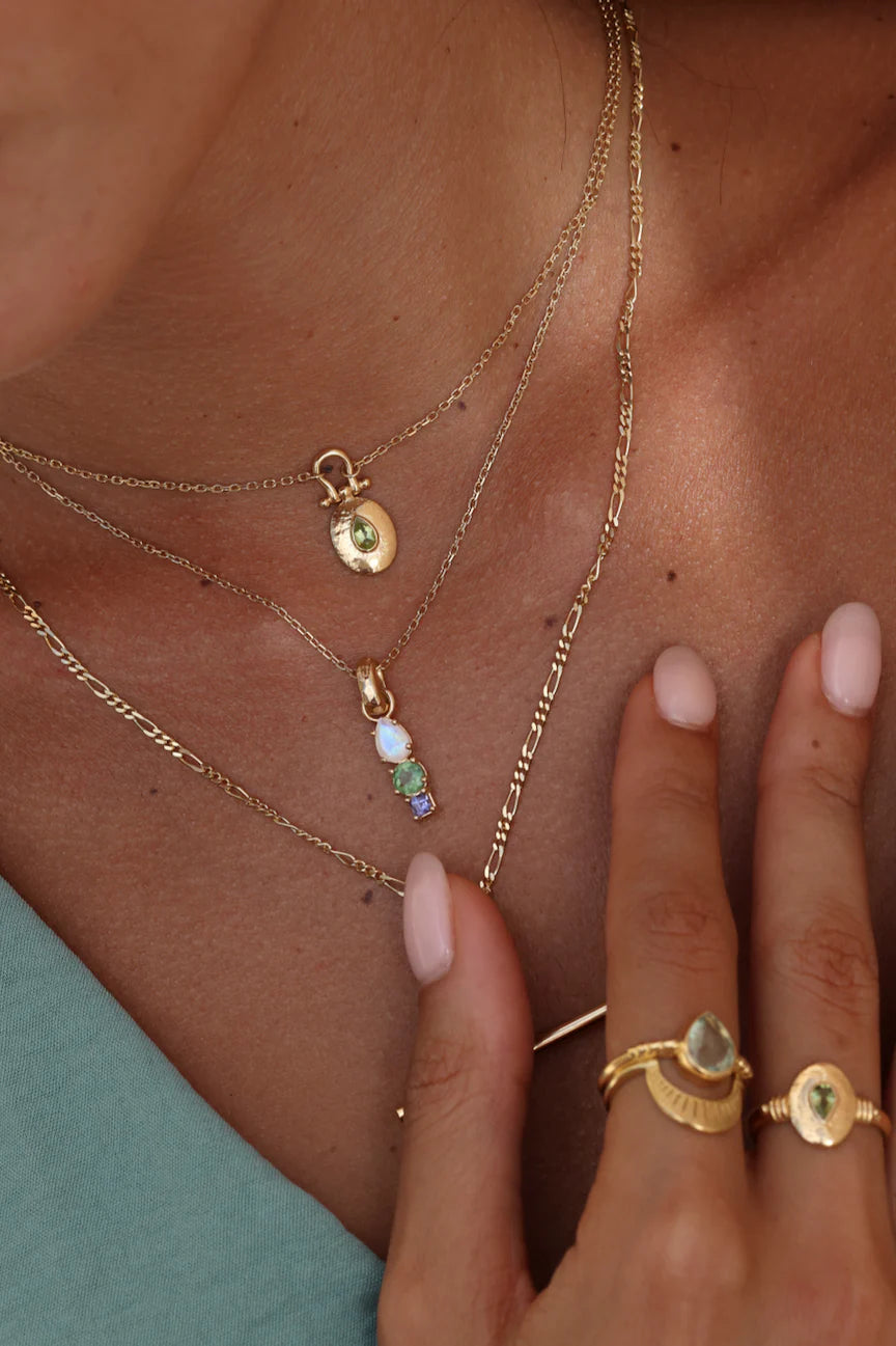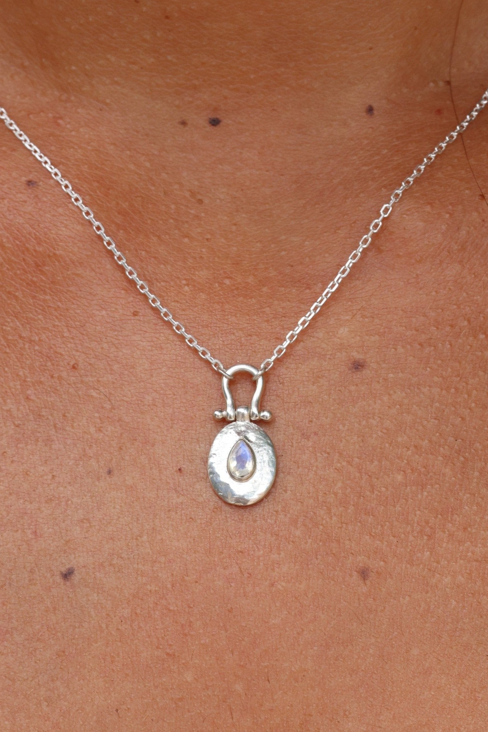 Our Esme Necklace features a stunning hand cut pear stone set into a delicate hand hammered distressed shield pendant.