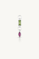 The Calypso Charm features a baguette-cut Peridot stone linked to a delicate marquise Pink Tourmaline, designed to gently swing and bring a touch of movement to your stack.