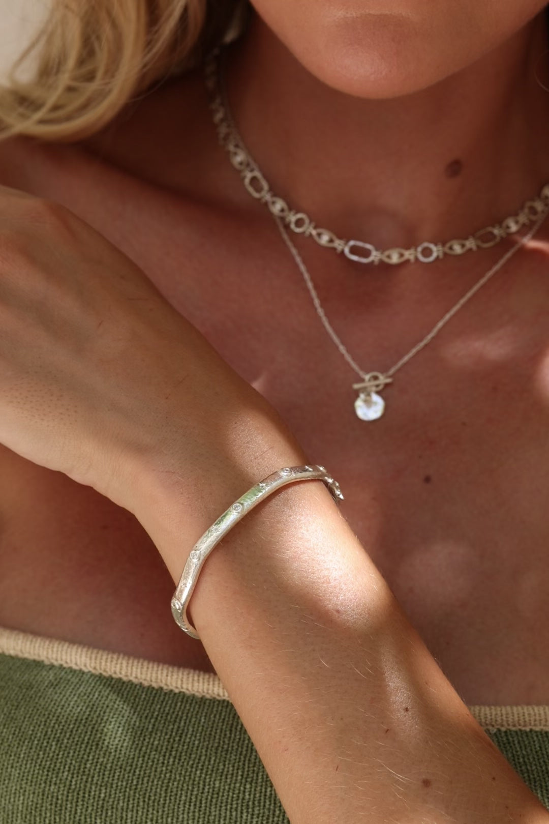 Starburst motifs with glowing White Topaz twinkle along the entire bangle, creating a shimmering constellation around your wrist. The bangle’s close-fitting shape and secure push clasp with an additional latch make it as reliable as it is stunning.
