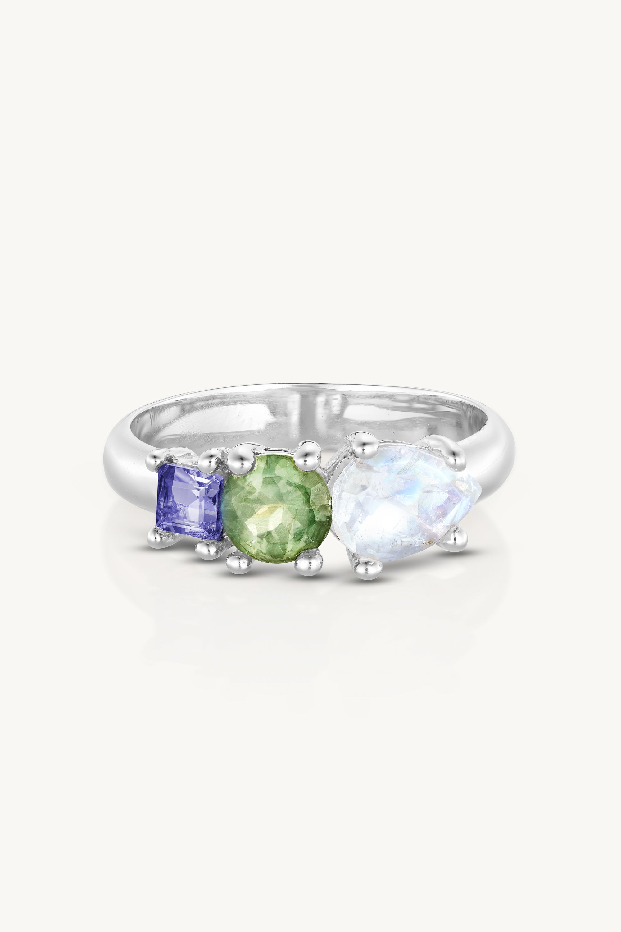 The Dixie Ring is a cluster set band designed to be layered and worn with our Dixie Earrings and Dixie Style necklace. The band features a graduating set of delicately claw set stones including a stunning rainbow Moonstone marquise, luminous round Apatite and bright Iolite baguette.