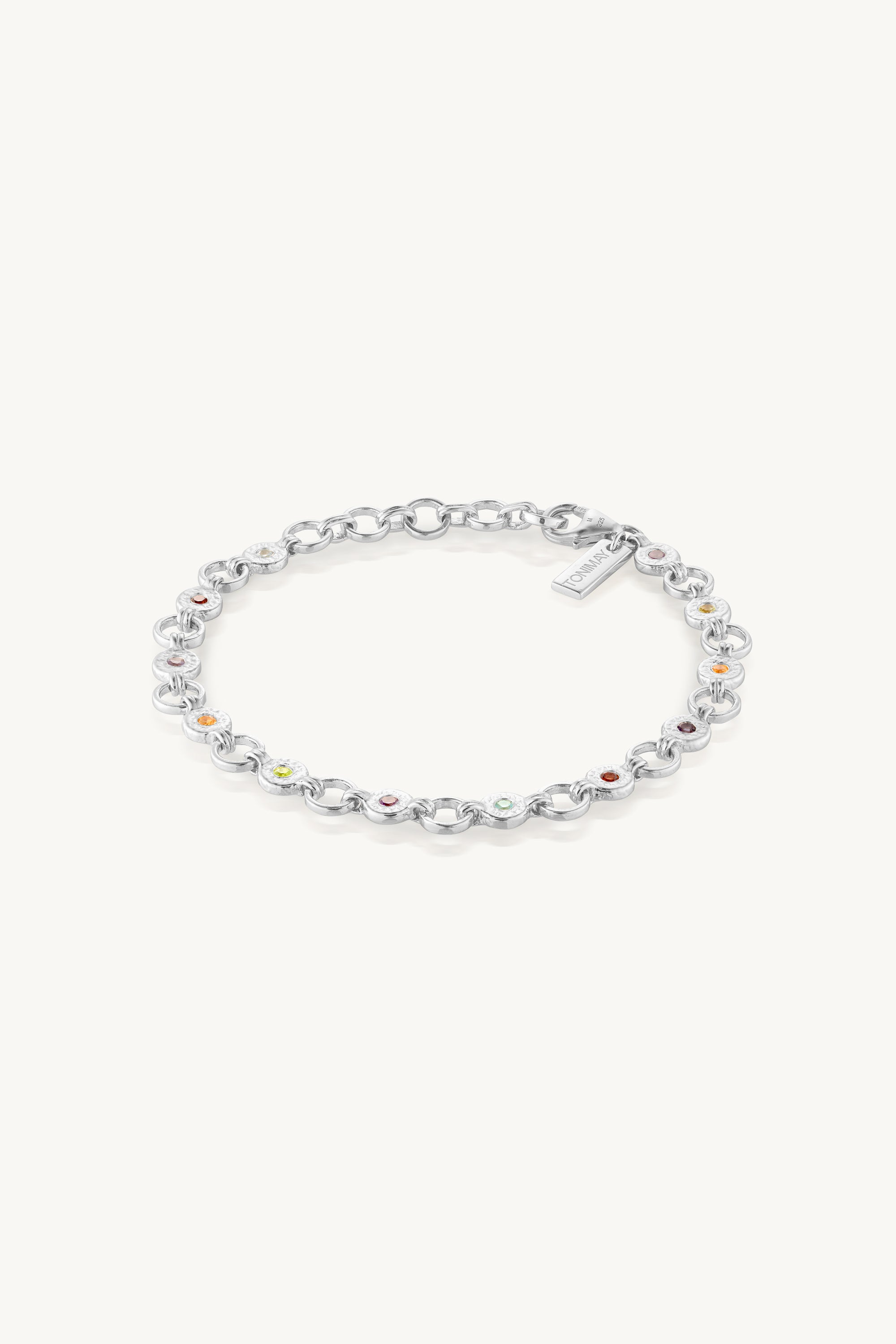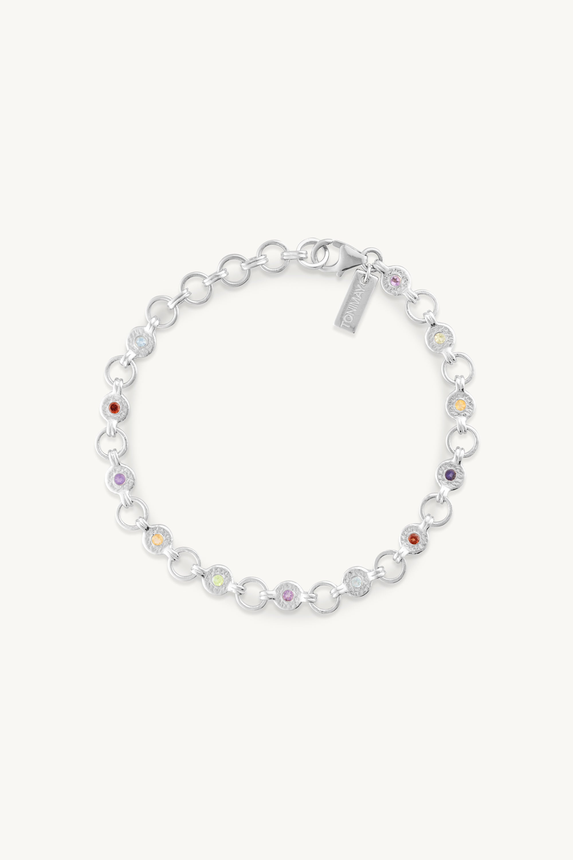 This handcrafted chain features a series of circular motifs, each set with a different natural gemstone: Amethyst, Peridot, Citrine, Iolite, Garnet, and Blue Topaz. Thoughtfully designed and meticulously crafted, this piece brings a playful elegance to any look—whether worn solo or stacked.