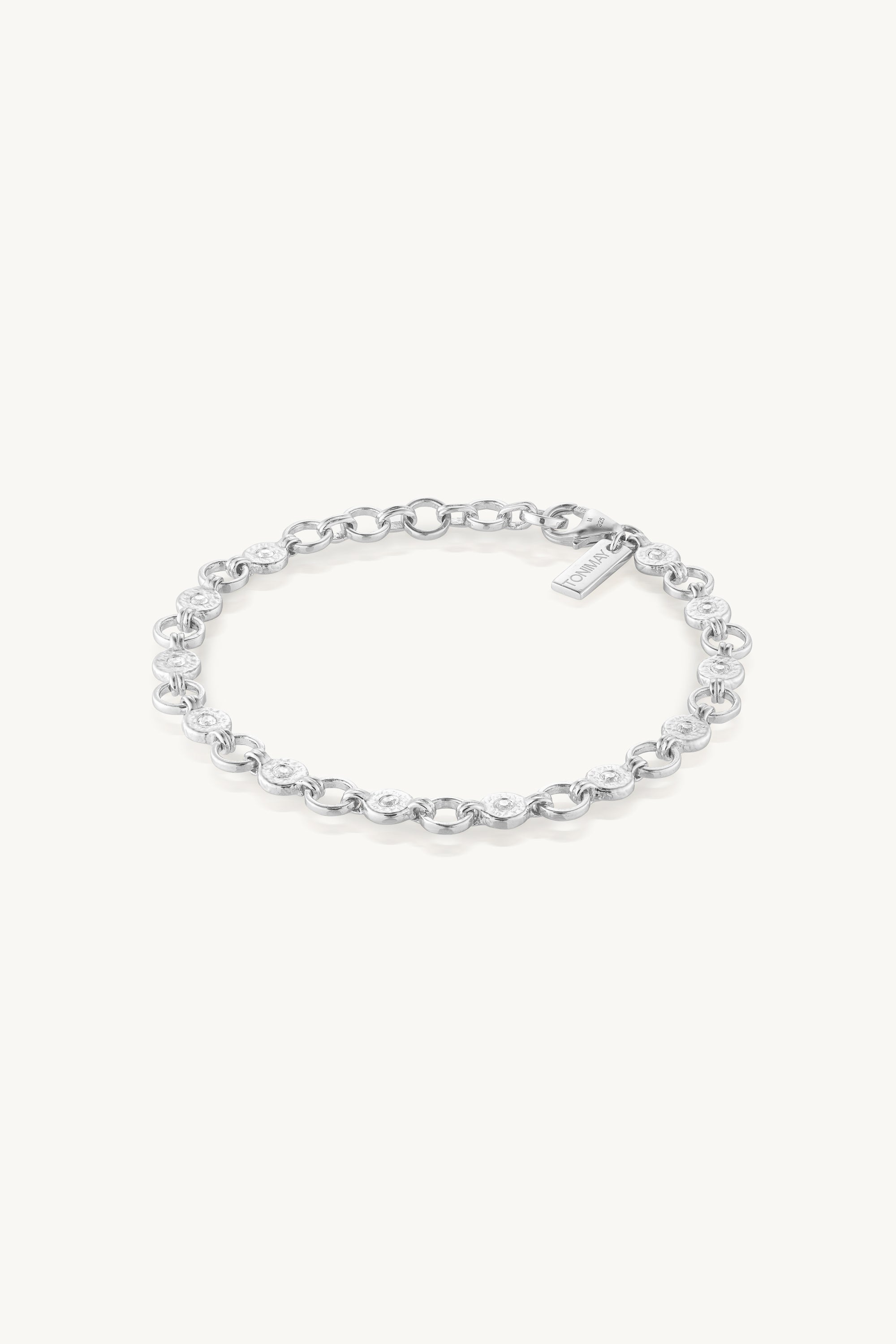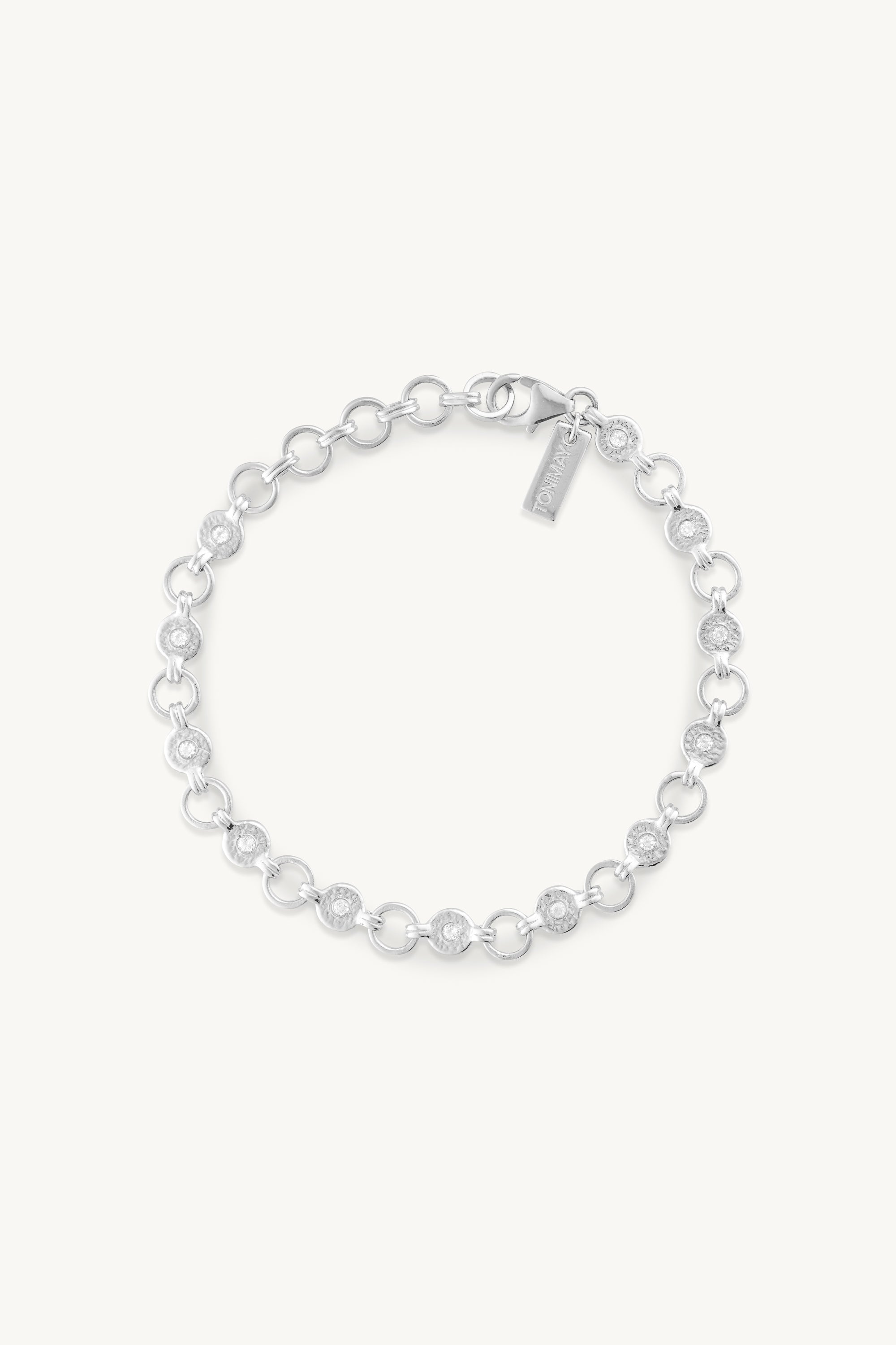 This handcrafted chain features a series of circular motifs, each adorned with a round White Topaz at its centre. Thoughtfully designed and meticulously crafted, this is a timeless pieces that adds just the right amount of shine to your wrist, whether worn solo or layered.