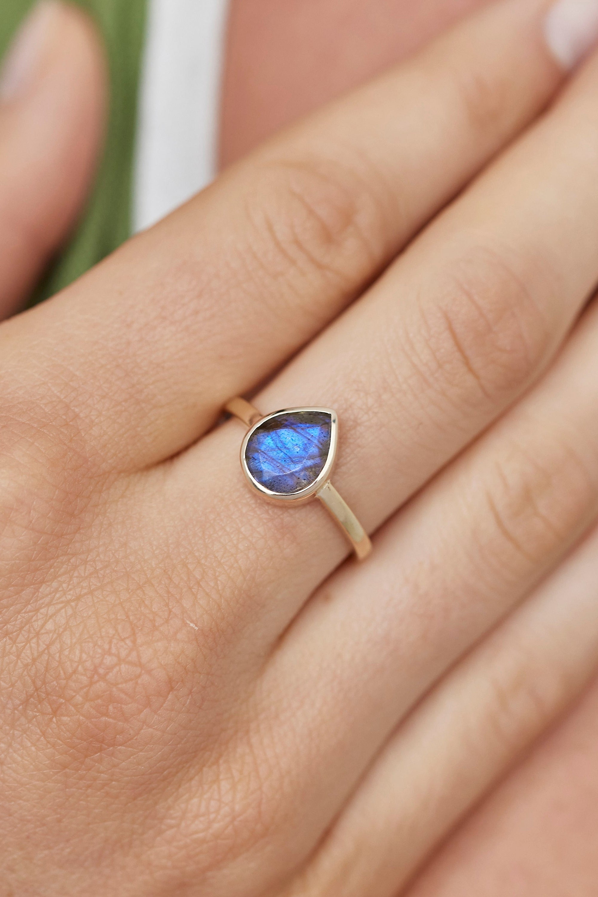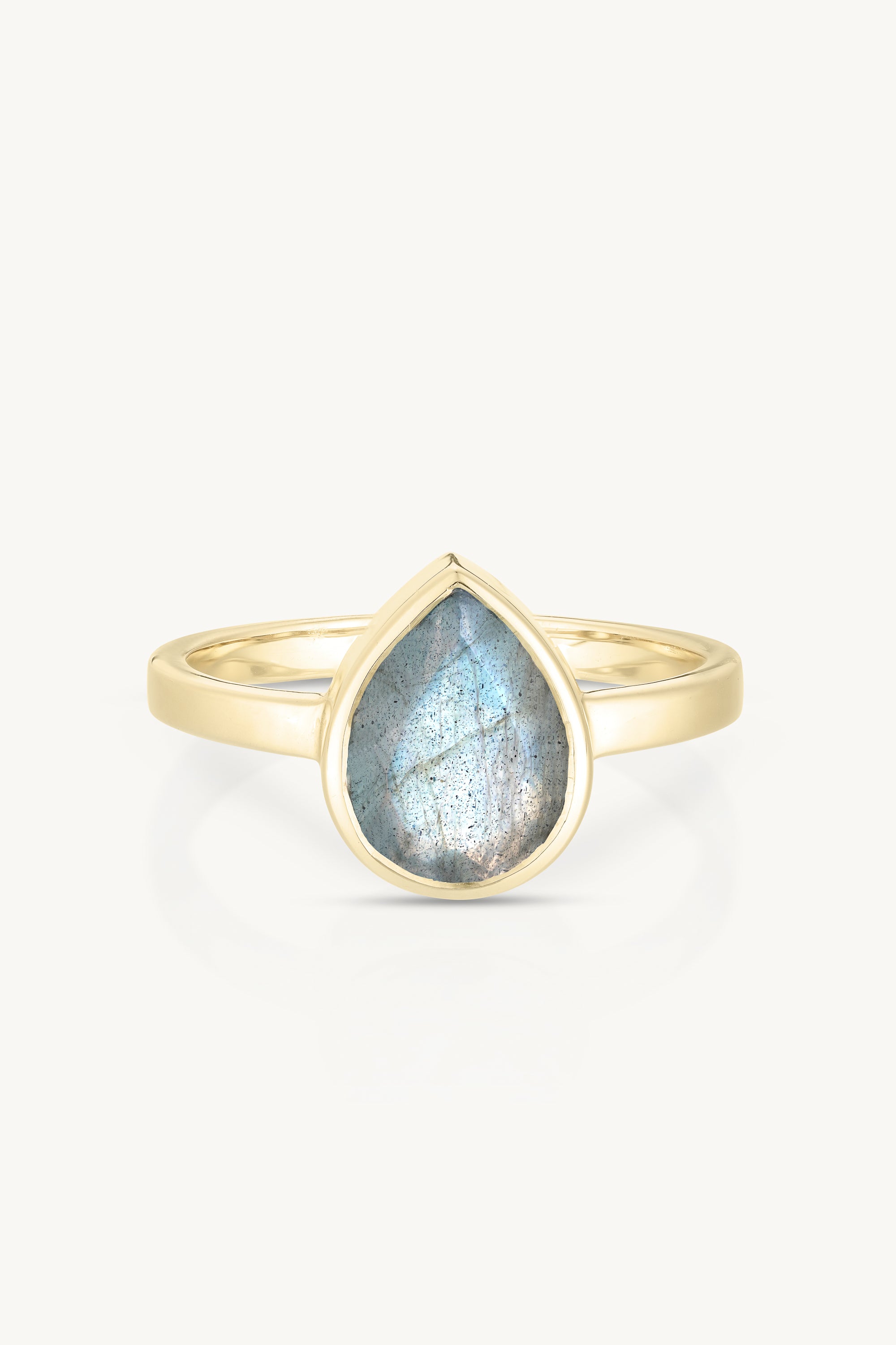 Simple yet bold is this handmade 9k Yellow Gold faceted Labradorite ring. This beautiful iridescent piece of Labradorite captures beautiful blue, purple and green flashes when hit by light.
