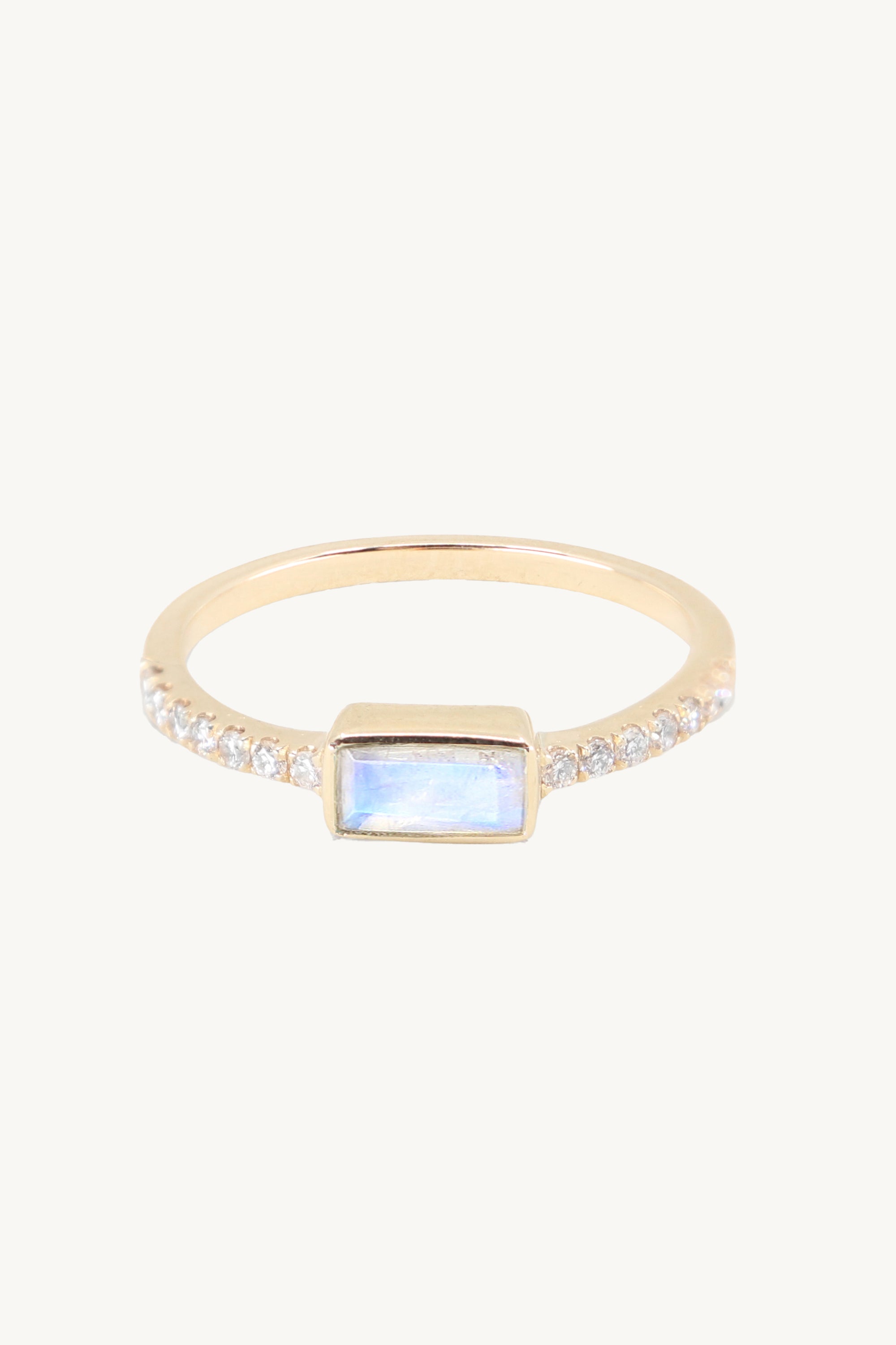 This is the perfect little ring to spoil yourself or someone you love with. Featuring a stunning luminous baguette cut Moonstone, the Moonstone is bezel set with a band of pave white diamonds on either side.