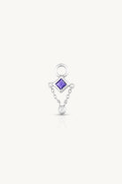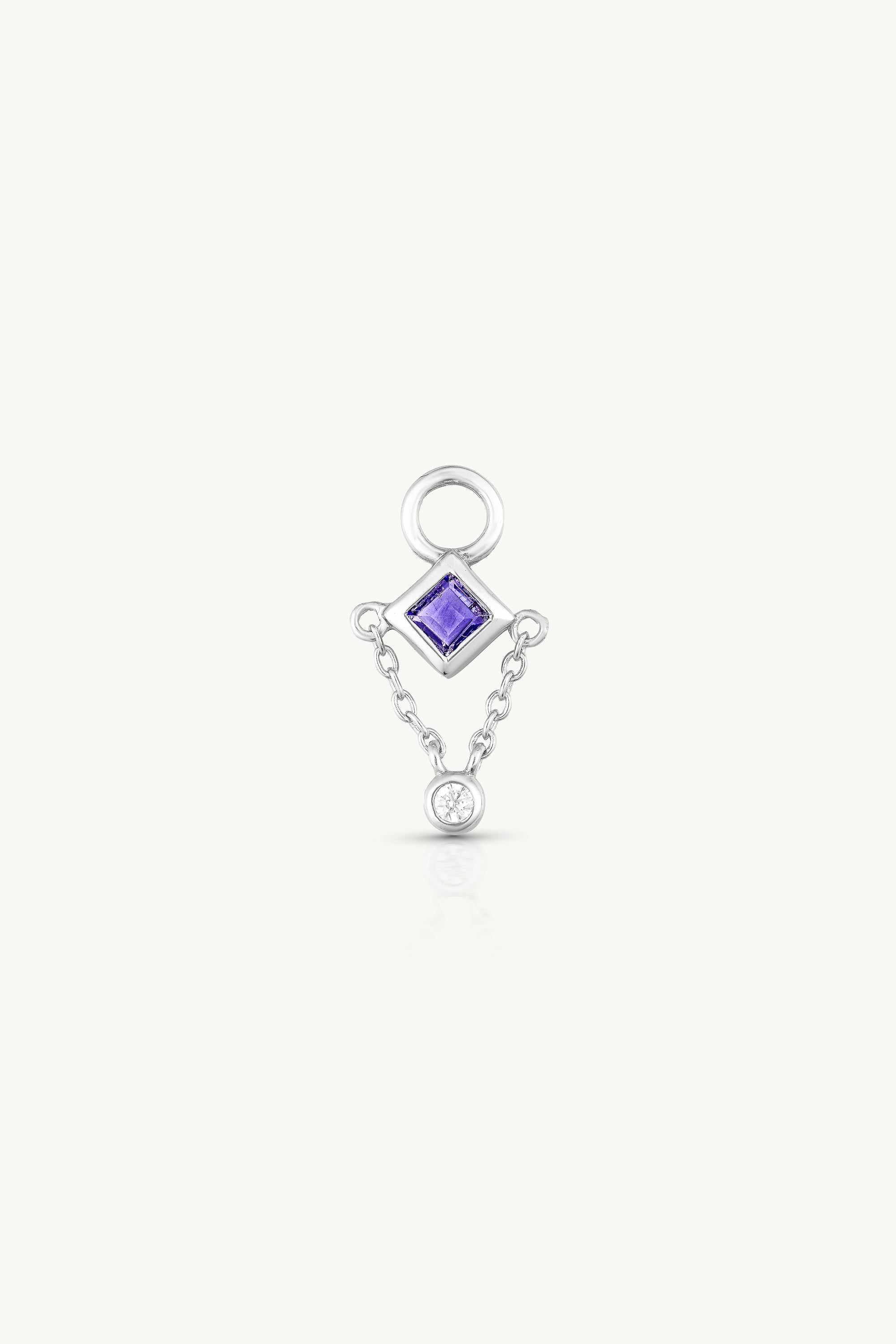 The Orion Charm features a square Iolite bezel set, with delicate draping chains that suspend a sparkling Cubic Zirconia drop.
