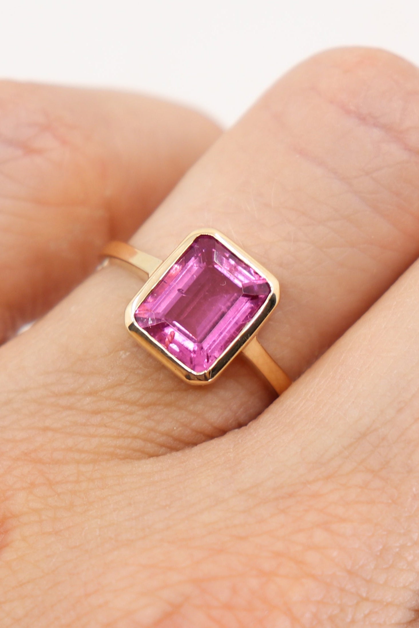 This beautiful tourmaline is handmade in 9K yellow gold featuring a brilliant bright pink tourmaline stone.
