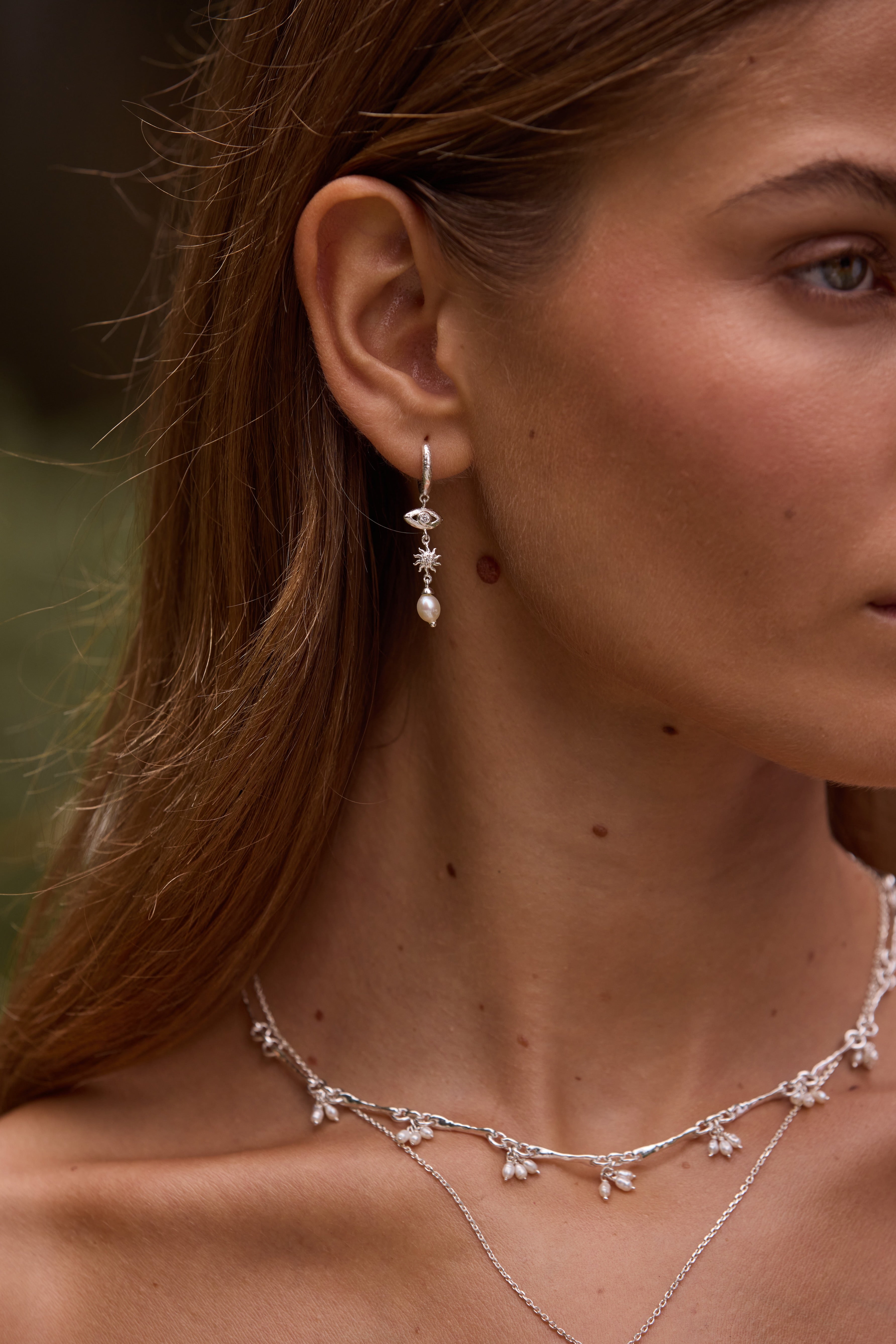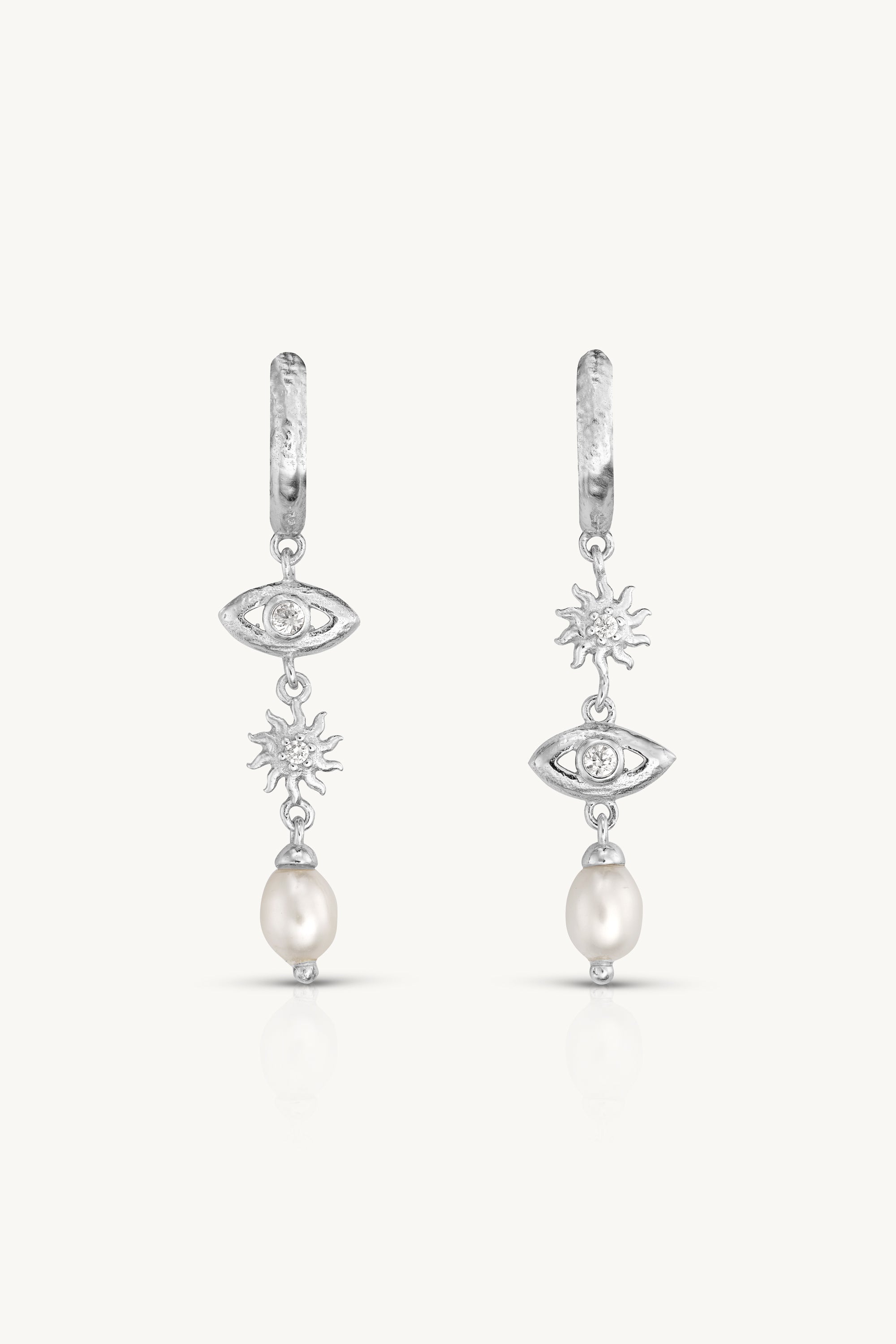 The Soleil Earrings feature a textured huggie that cascades into a protective evil eye and a golden sunburst, finished with a classic, iridescent pearl drop. Designed for the dreamers and the sun-seekers, these are your new everyday companions for chasing light and collecting memories.