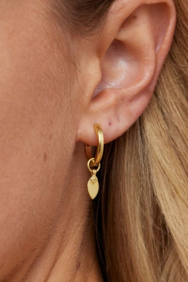 The Spear Earring Charm is a high polished marquise shaped charm with pointed detail at the bail. With delicate detailing the charm swings freely on the hoop.