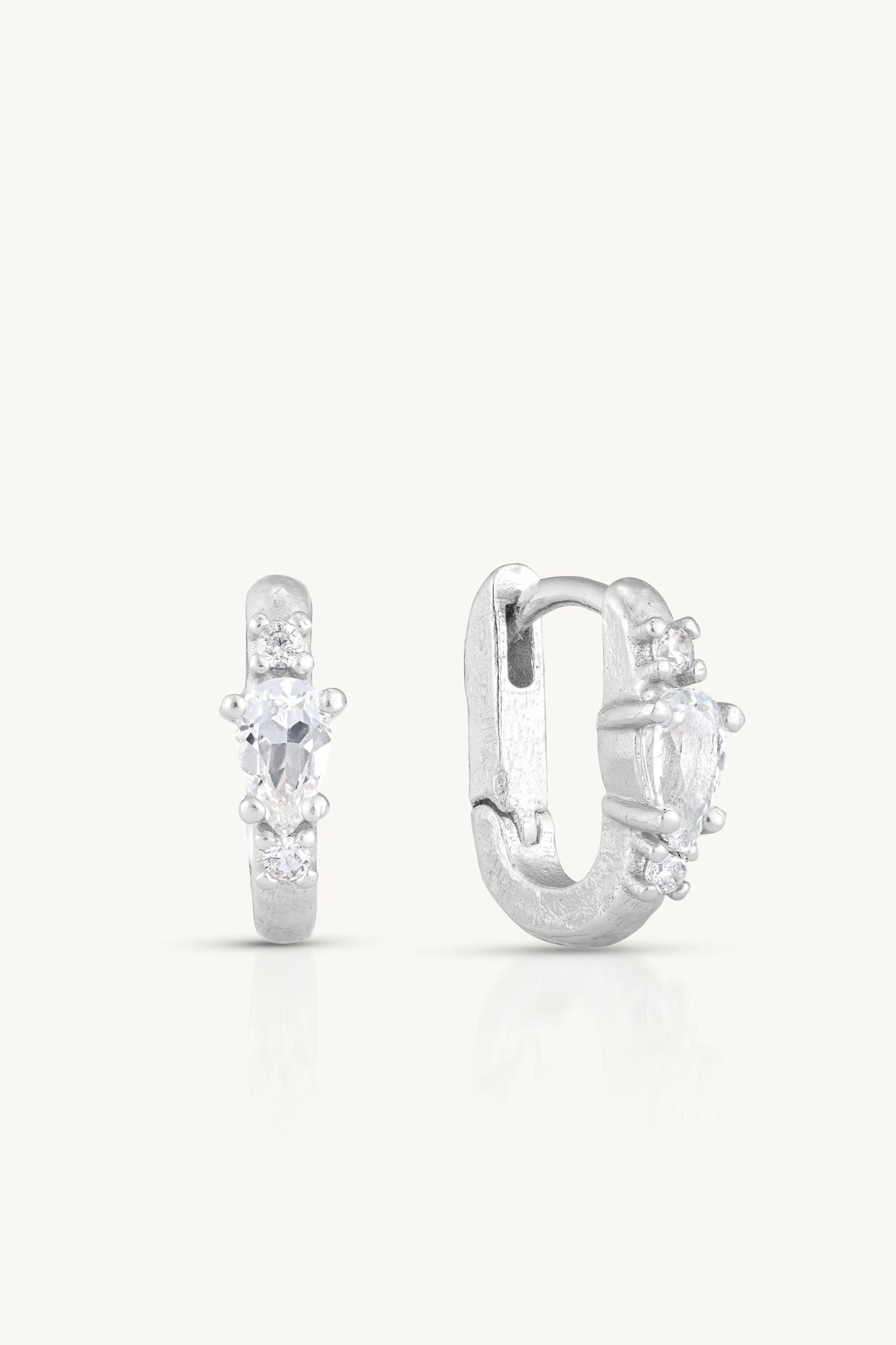 The Textured Topaz Huggies feature three prong-set stones set along a petite textured paperclip huggie. A marquise-cut centre White Topaz stone is flanked by two delicate round Cubic Zirconia stones, creating the perfect balance of shimmer.