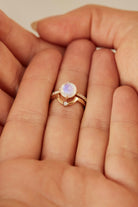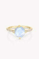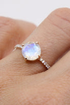 This magnificent moonstone solitaire ring is the handmade with 9k yellow gold and boasts 14 accent white diamonds in the band.